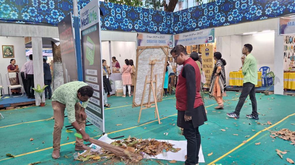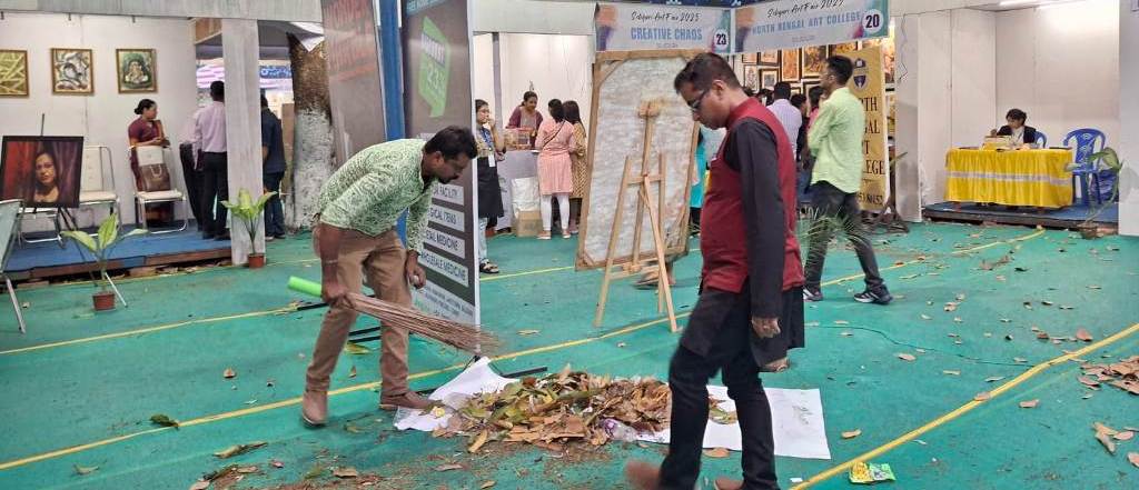 বসন্তের বাতাসে ঝরাপাতায় ভরে গেল রঙিন একটি মেলা। এক শিল্পী রং-তুলি ফেলে হাতে তুলে নিলেন ঝাড়ু। আরেক শিল্পী বস্তা হাতে সেই জঞ্জাল তুলে সরিয়ে দিলেন। মেলা প্রাঙ্গন আবারও ঝলমলে হয়ে উঠল। ক্যানভাস রেখে শিল্প বাঁচানোর তাগিদে যারা ঝাড়ুদার হতেও দ্বিধা করেন না, সেই দুই ব্যক্তিত্বের নাম সঞ্জয় দে ও সুজয় মিত্র। নর্থবেঙ্গল পেইন্টার্স অ্যাসোসিয়েশনের সভাপতি ও সম্পাদক। এই দু’জন মানুষের অক্লান্ত পরিশ্রমের জন্যই এবার বড় পরিসরে অনুষ্ঠিত হচ্ছে শিলিগুড়ি আর্ট ফেয়ার।