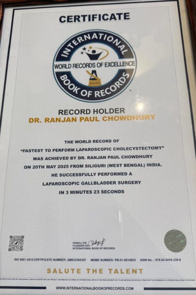 যেন ম্যাজিক। পেটে হাত দিতেই নিমিষে বেরিয়ে এলো জোড়া পাথর। একেকটি পাথরের আকার ১০ মিলিমিটার। রোবটিক সার্জারি করালেও কিছুটা সময় লাগে। কিন্তু শিলিগুড়ির শল্য চিকিৎসক ডাঃ রঞ্জন পাল চৌধুরির হাত যেন যাদু। মাত্র ৩ মিনিট ২৩ সেকেন্ড সময়ে গলব্লাডার স্টোন অপারেশন সেরে ফেললেন। গোটা পৃথিবীতে এত কম সময়ে গলব্লাডার অপারেশন আর কেউ করতে পারেননি। যে কারণে ইন্টারন্যাশনাল বুক অফ রেকর্ডস কমিটি তাঁকে স্বীকৃতি জানিয়েছেন। অস্ত্রোপচারে বিশ্ব রেকর্ড করা শিলিগুড়ির শল্য চিকিৎসক ডাঃ রঞ্জন পাল চৌধুরিকে নিয়ে তাই গর্বের শেষ নেই শিলিগুড়ি শহরবাসীর। কারণ একজন ডাক্তার যিনি রোবটকেও হার মানিয়ে দিয়েছেন।